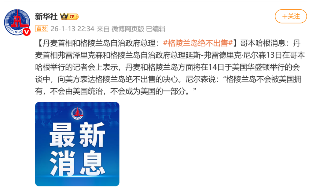 哥本哈根讯:丹麦首相弗雷泽里克森与格陵兰岛自治政府总理延斯-弗雷德里克·尼尔森,于13日在哥本哈根共同召开记者会并明确表态。两人表示,在14日于美国华盛顿举行的会谈中,丹麦与格陵兰岛代表团将向美方清晰传递核心立场——格陵兰岛绝不可能出售。尼...