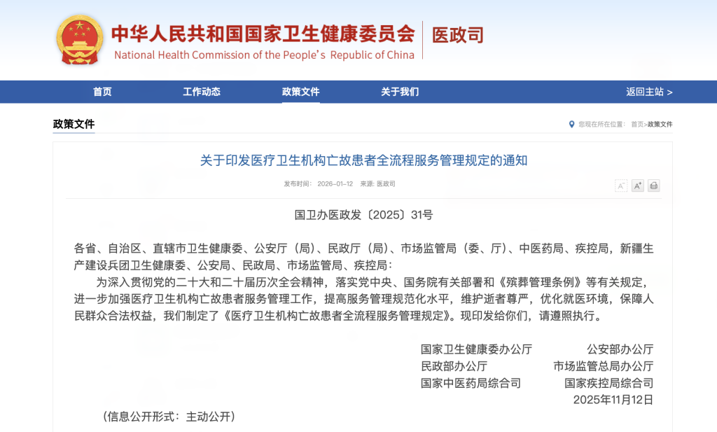 国家卫生健康委联合其他5个部门,于1月12日发布了《医疗卫生机构亡故患者全流程服务管理规定》。新规明确要求,医疗卫生机构需坚守自身核心服务职责,不得开展任何殡仪相关服务。