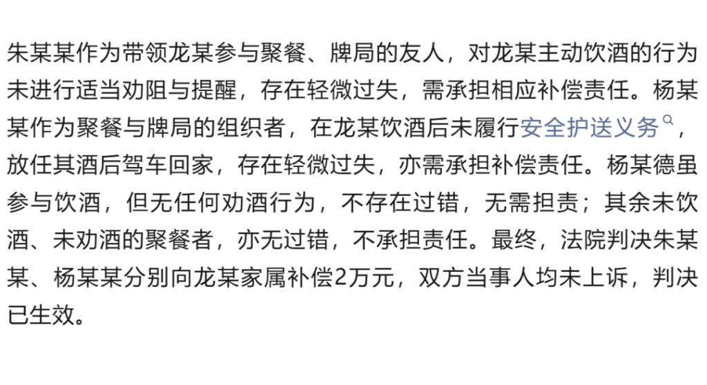事情发生在2025年2月春节期间,龙某跟着朋友朱某某一起,去杨某某家拜年,还参加了他家的家庭聚餐。吃饭的时候,杨某某问在座的人要不要喝酒,龙某和杨某德都说可以少喝一点。于是,杨某某就给龙某倒了大概1两散装白酒,给杨某德倒了约2两,其他一起吃饭的人都没喝酒,也没人劝龙某、杨某德多喝。