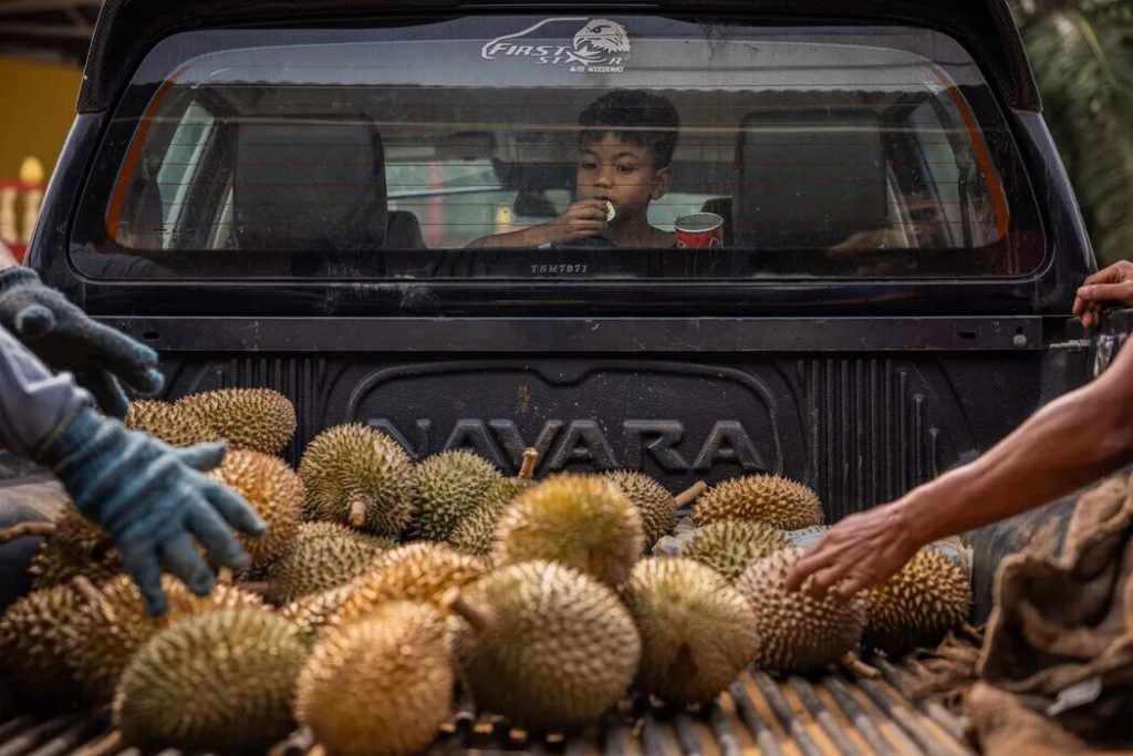 往年一到一二月的丰收季,从普拉纳村的榴莲园开车往斯兰穆特山方向走,通往克布门村的整条道路两旁,都会摆满果农们的摆摊摊位,榴莲堆得满满当当,来往采购的商贩和路人络绎不绝,热闹得像集市一样。