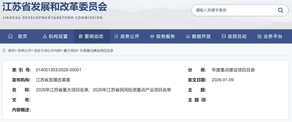 重大项目是推动经济社会高质量发展的核心引擎。1月9日,江苏省发展和改革委员会官网正式公布2026年江苏省重大项目清单及省民间投资重点产业项目清单,凭借扎实的项目规划和可观的投资增长,释放出稳定发展预期、提振市场信心的明确信号。