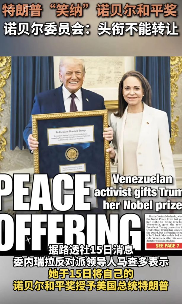 需要明确的是,即便马查多主动将奖章赠予特朗普,这一荣誉也仅能代表她个人立场。挪威诺贝尔委员会此前就已明确规定,诺贝尔和平奖不允许转让、共享,也无法撤销。此外,特朗普在14日接受路透社采访时,曾被问及是否希望马查多将该奖项赠予自己,当时他明确回应:“不,我从没这么说过。这个诺贝尔和平奖是她赢得的。”