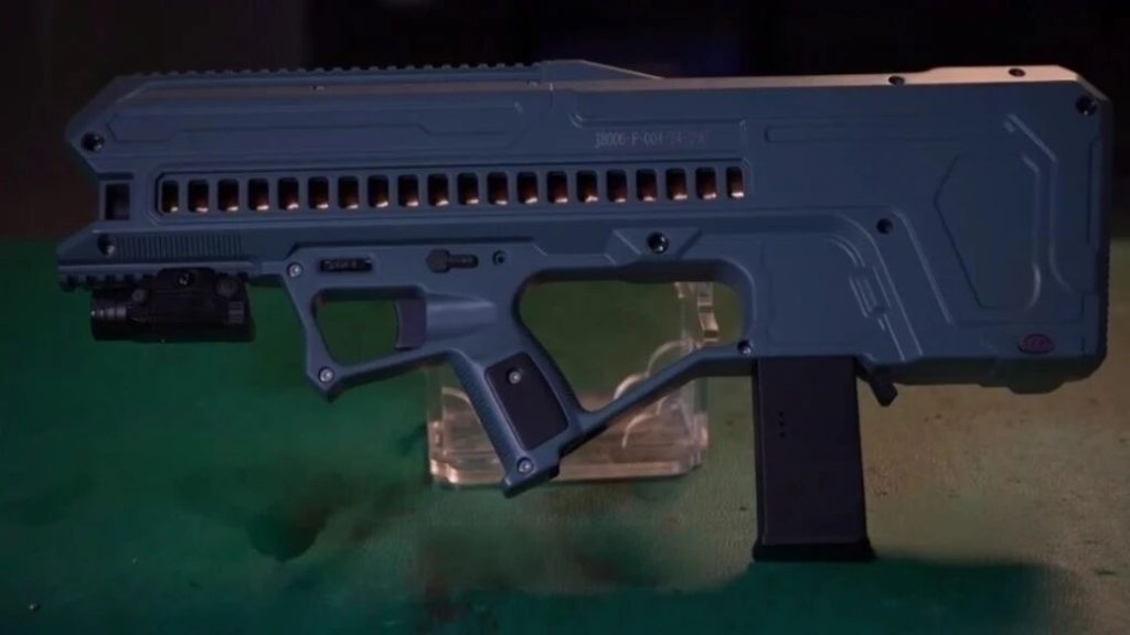 “电子化”操作:这把枪长得像个黑色的方盒子,握把在中间,后面是弹匣。最酷的是,枪身上还有个电子显示屏,电量、剩余子弹、射击模式一目了然。这哪是枪啊,简直是“掌上电脑”。