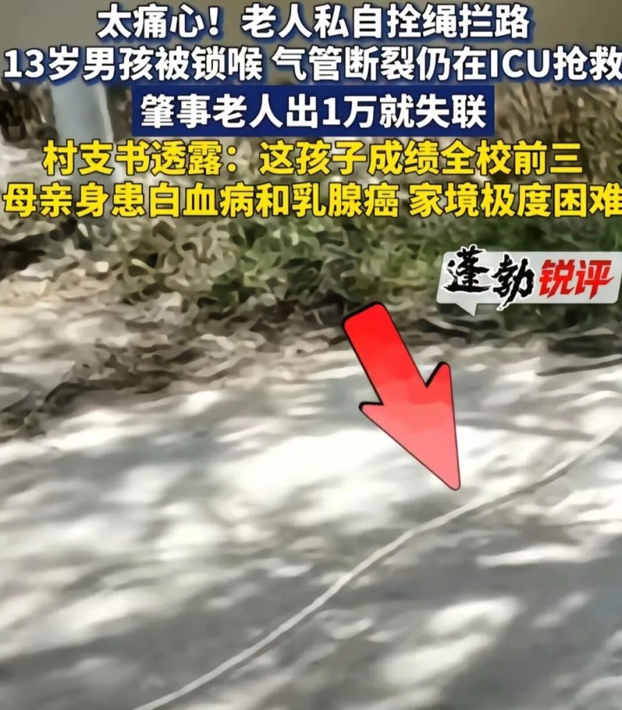 该事件发生于4月4日下午。当时,13岁的男孩黄某骑电动自行车在村中公共道路上行驶时,不幸被同村一名70岁左右的村民私自横拉在路中的绳索割伤颈部。