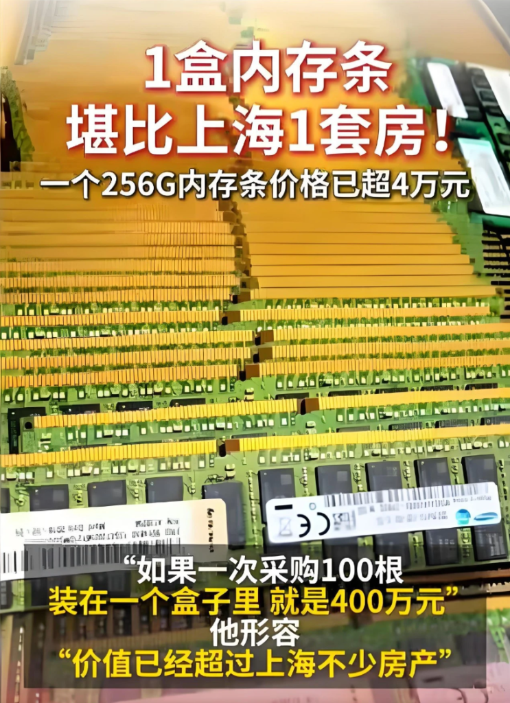 到了2026年,涨价不仅没停,反而涨得更快了。行业里有位叫吴深(化名)的人士说,现在内存几乎是“一天一个价”。就拿256G的服务器用DDR5内存来说,单条价格已经超过4万元了。他还算了笔账:要是一次买100根装在一个盒子里,总价值就有400万元,这都能在上海买套不错的房子了!