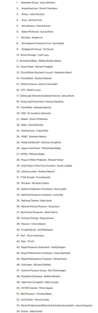 这趟随行的“企业天团”里藏着不少行业巨头的核心人物:比如空客总法律顾问兼公共事务主管约翰·哈里森、阿斯利康全球首席执行官苏博科,还有渣打集团首席执行官温拓思、汇丰集团主席利伯特、巴克莱银行中国区CEO刘洋。医药领域的葛兰素史克董事会主席司明麒、制造业的捷豹路虎首席执行官Pathamadai Balaji、迈凯伦首席执行官Nicholas Collins也在其中,就连英国航空首席商务官Colm Lacy、英美资源集团董事长钱思铎等也一同随行。值得一提的是,文化领域也有代表参与,世界职业台球和斯诺克协会(世台联)主席杰森·弗格森、英中贸易协会主席吴思田都在代表团名单里。