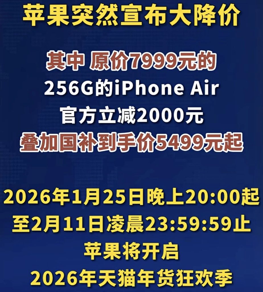 想入手苹果产品的朋友注意啦!苹果官方旗舰店的新年大促销活动即将上线,已经引发了不少消费者的关注。从苹果天猫旗舰店的公告来看,2026年1月25日晚8点到2月11日23:59:59,天猫年货狂欢季期间,多款苹果产品都会迎来降价福利,其中刚上市不久的iPhone Air降幅尤为抢眼。