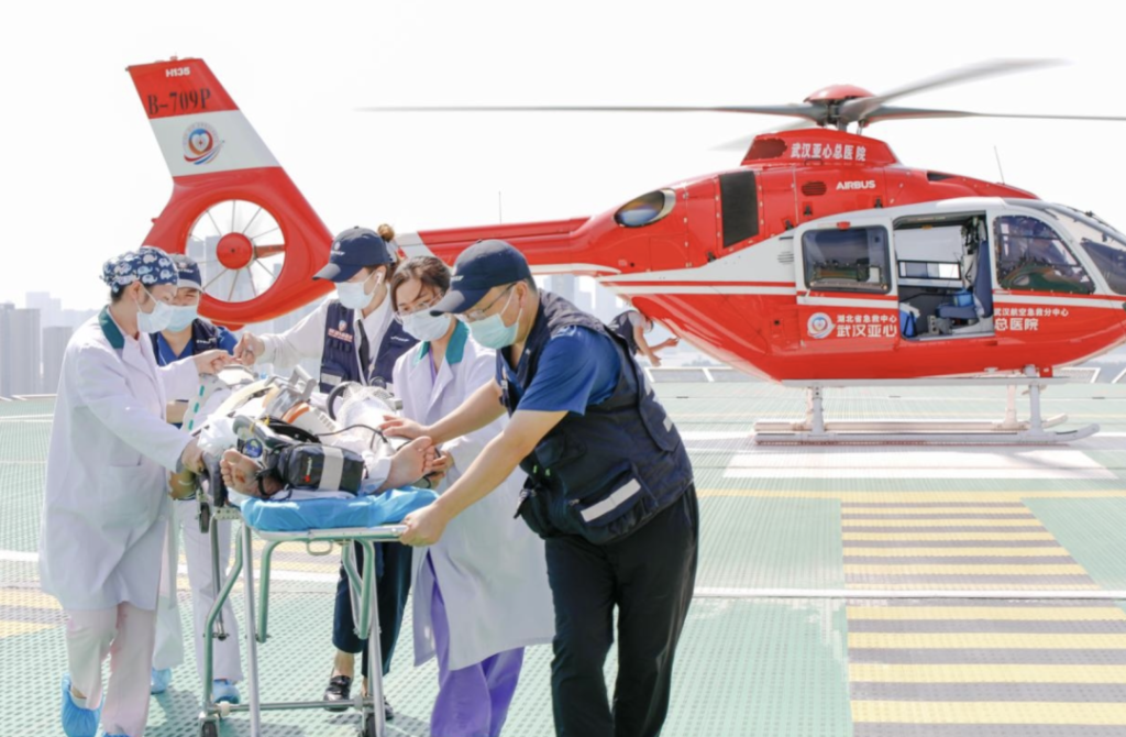 生死时速就此开启。武汉亚心总医院紧急调派救援直升机“亚心一号”升空驰援。这架空中“移动ICU”搭载专业医疗团队,直飞荆州。机舱内,呼吸机、监护仪、除颤仪等设备一应俱全,医护人员全程严密监护,确保患者生命体征平稳。