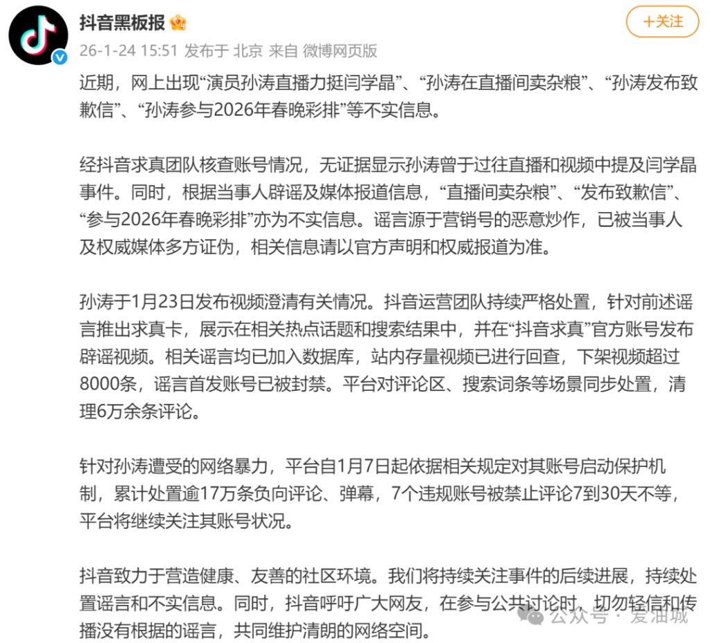 孙涛的澄清很快得到了平台的佐证。1月24日,抖音官方账号“抖音黑板报”发微博回应,明确表示网上关于孙涛的一系列传言都是不实信息。